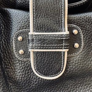 Cute Franco Sarto Black and White leather shoulder bag. Adjustable 27" strap, which can be shortened to 17". Silver hardware (not gold as it may appear) and super strong magnetic closure. Clean black Franco Sarto printed nylon interior. The exterior is in good condition—3 internal pockets. One for glasses or maybe a flip phone, 3"W x 4"H x .05" D, Pocket next to the smallish pocket - 6"W x 4"H x .05" D, Pocket on opposite side of the bag- 8"W x 4"H x and will hold however much stuff you want to put into it. Very flexible free-hanging pocket.