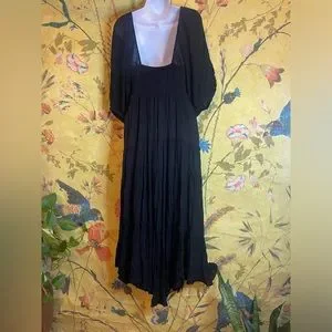 Features: Puffed sleeves, ruched bust detailing, asymmetrical tiered skirt, smocked back for ease, raised seaming