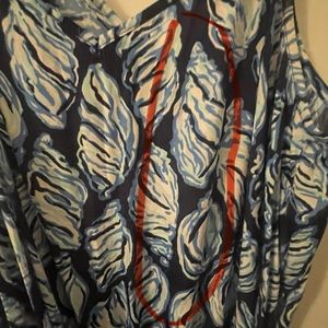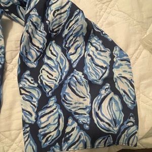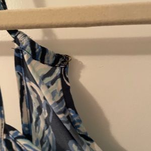 Lilly Pulitzer Dusk Jumpsuit in Drop In. This jumpsuit has some minor flaws. Most are not very noticeable but I want to call it out. There is the smallest run on the front which I circled as best as I could. It’s so small it’s hard to see in photos. The hem has some minor pilling but again it’s so small it’s hard to see in photos. Lastly the hook fell off but we have the eye. Simple fix for someone who knows how to sew. Great deal and price reflects flaws.