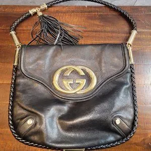Authentic Vintage Gucci Black Leather Britt Tassel Bag, approx. 11"(L)x13.5"(W), very good condition, no visible signs of wear or damage, very clean inside. Ironically, this Britt bag was purchased in Britain, at the Gucci store in London. Comes with dust bag.