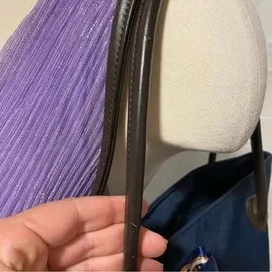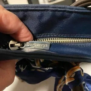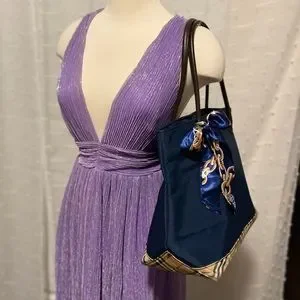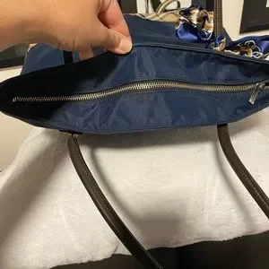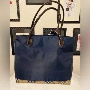 Authentic. This bag is GORGEOUS! In excellent condition with minimal signs of wear. Beautiful blue nylon is accented by dark leather handles and Burberry’s classic nova check pattern. Clean inside and out. Minor scratches to handle as seen in photo. Large size tote. See photos for measurements. Twilly is removable. Added for extra beauty!