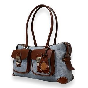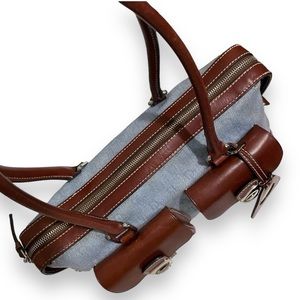 Dooney & Bourke Signature Denim & Brown Leather Double Pushlock Pocket Satchel Shoulder Bag