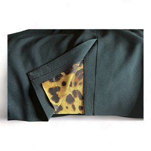 This Dolce & Gabbana size 8 designer black cocktail dress, flattering and unique, is ruched around external corset stays punctuated about the bodice emphasizing your curves. Mid-length, it has a modest slit up the bottom back center. It closes with a dramatic zipper up the back framed in satin fabric. The dress is fully lined in sexy leopard print and is beautifully tailored. Pre-owned but in very good condition with minor, minor pulls along edging of the armhole on left - see picture. Made of Acetate, Rayon and Spandex, dry clean only.