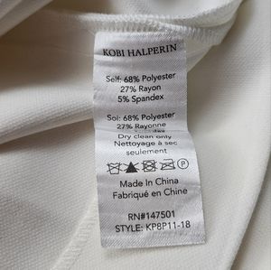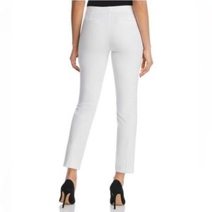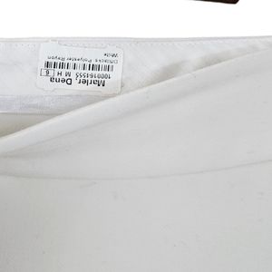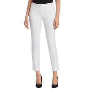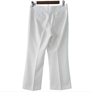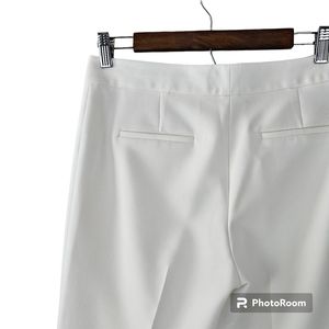 These womens size 6 white pants have a zipper and clasp closure with inner anchor button. Belted back pockets. 68% polyester 27% rayon 5% spandex. Excellent pre-loved condition.