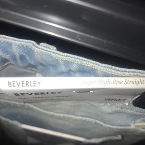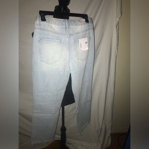 Iconic denim style of the 1990, feature high rise waist and flare legs.Fly zipper,Light wash out blue. Waist 17 inches, Length 361/2 , Hips- 19 inches. It’s also has a ripple effect on the jeans.