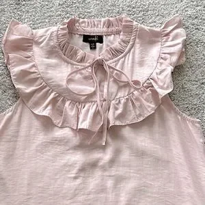 Pink Sleeveless Ruffle Front Blouse. Gorgeous summer staple. Sleeveless. Ruffle detail around the neckline and tie at the neck on front. 60 rayon 40 polyester. New boutique item.