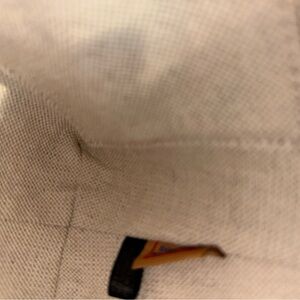 Should the fabric become soiled, cleaning should be done with a soft cotton cloth or soft toothbrush slightly dampened with distilled water (sodium-free seltzer water may be substituted) and a mild bar soap, applied in a circular motion. Repeat with distilled water only to ensure no residual soap remains. The material should then be allowed to dry completely.