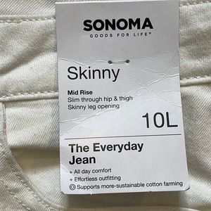 Sonoma Goods for Life Everyday jeans in bleach white. Skinny silhouette and mid rise. Slim through hip and thigh. Jeans have stretch. Also in a Long size.