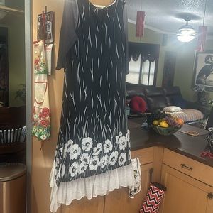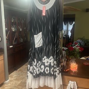 Beautiful dress bought it a small boutique has a ruffle on the bottom a pocket on the front it’s very flowing and romantic sleeves are a little sheer as well as the bottom ruffle and pocket new with tag