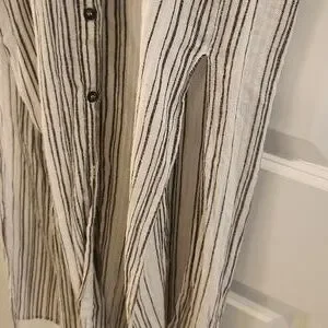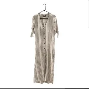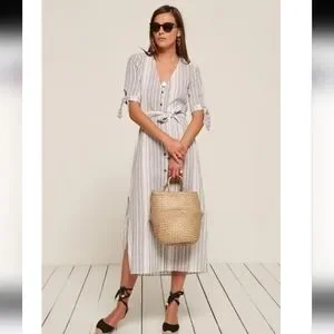 Reformation striped linen maxi dress size medium. Buttons on full length of dress, tie sleeves, slits on either side of dress. Please note dress is in good condition except that the fabric belt is missing, label is worn, and discoloration on trim on inside of neck.