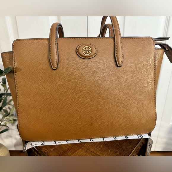 Tory Burch pebbled leather small Robinson tote with slit pockets brown
