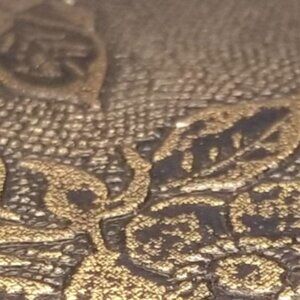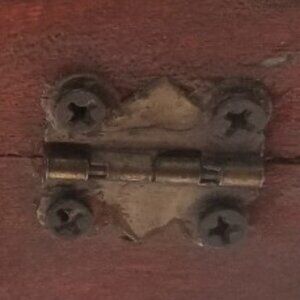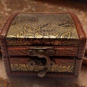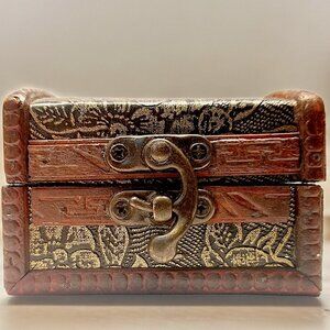 This beautifully renovated small antique style jewelry box is made of wood, and adorned with elegant copper color florals, Its rectangular design evokes a sense of timeless charm, while the curved metal catch ensures your items are safely stored within.