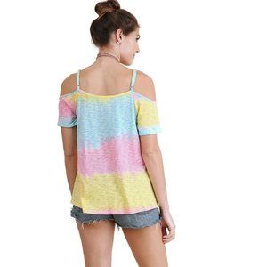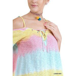 Umgee Lace Up Cold Shoulder Color Block Top, Lemon Mix