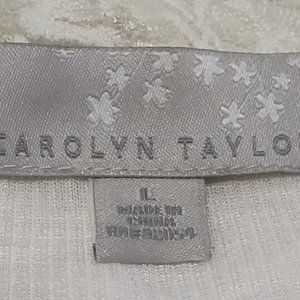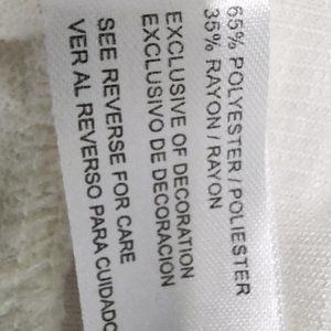 Carolyn Taylor brand beautiful white sweater. Has lace ruffles along edge of front opening and around hem. Very feminine. Looks pretty over a shift dress, skirt outfit, or even jeans with a light cream tank. Dress up or down. Size tag is Large. Lightweight material 65% polyester, 35% rayon. Machine wash cold (I would put in a hosiery bag), hang to dry.