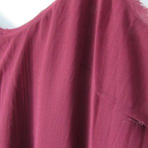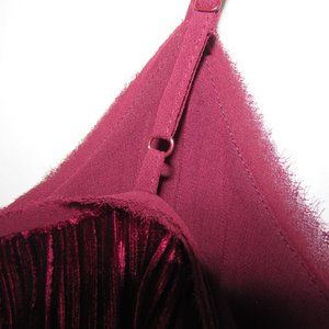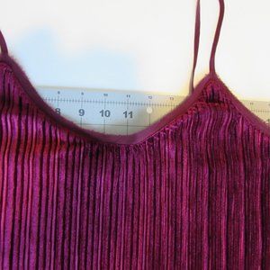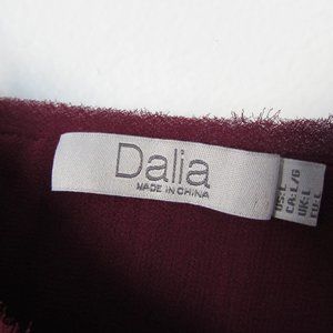 On offer, burgundy top made by Dalia clothing, it has a velvety textured fabric with vertical nap. Raw edged, slightly scooped neckline is fully lined and has adjustable thin straps. Approximately 19 inches across seam to seam and 18 inches from under arm to hemline, flat lay measure. Made in China, 100% polyester. Size is large.