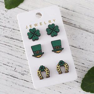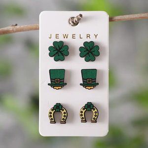 3 Pairs Set Of Green Hat Lucky Leaf Clover Horseshoe Design Stud Earrings Wooden