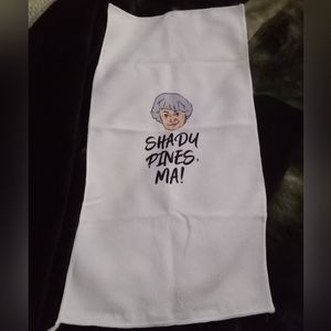 white dishcloth with golden girls themed "shady pines ma!" quote and picture of Dorothy's face.