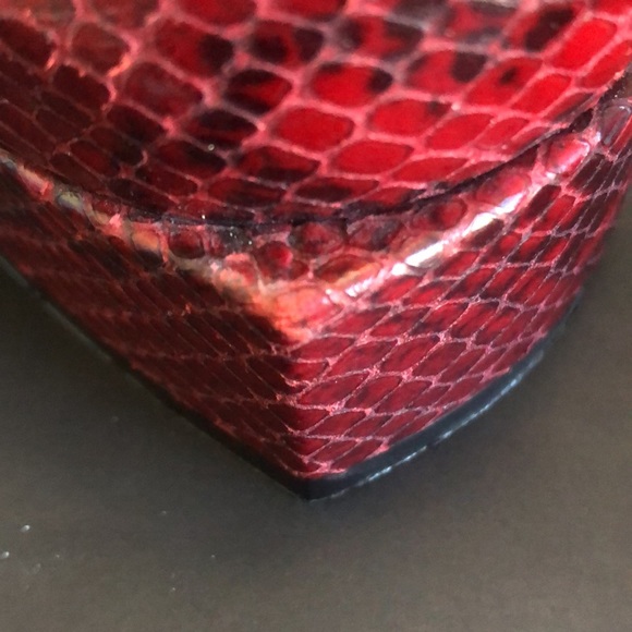 This classy closed toe red snake skin shoe has a 1-1/4 inch block heel.