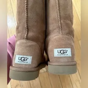 Classic chestnut tall Uggs. Just the wrong size for me so they’re barely worn. See pics of the sole. Never been treated with any weather proofing or other cleaning solutions. Nonsmoking home.
