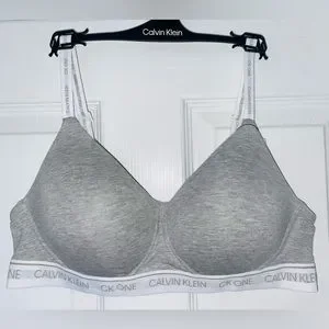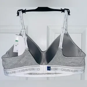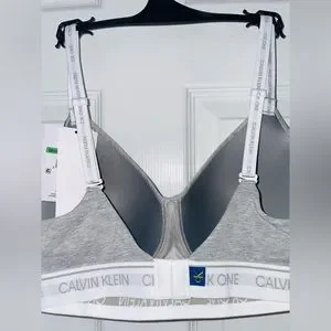Grey Calvin Klein CKOne Lightly Lined bralette. Straps are adjustable & convertible. Bra clasp in back. Padding NOT removed. White elastic CKOne logo under-bust band. Size medium & large available. Both new with tags.