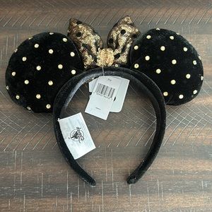Authentic Disney, ears headband. Black velvet like fabric with gold jewels on ears and sequin gold bow with polkadots brand new with tags still attached.