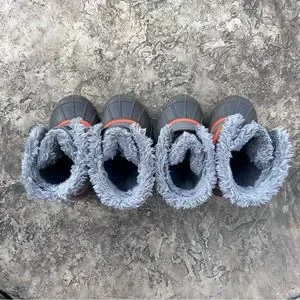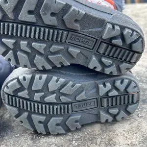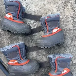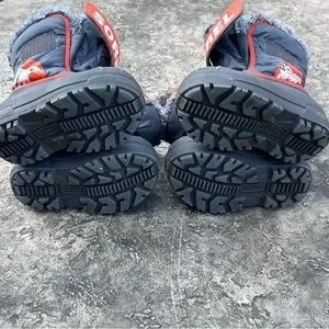 Both pair have peeling logos on the outer ankle. But that does not affect the functionality. Lower “shoe” are is waterproof. The uppers are insulated nylon and faux fur topped. Padded footbed. Clean Hook and eye wrap strap for a secure fit.
