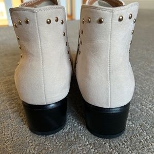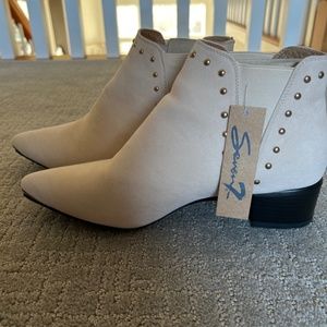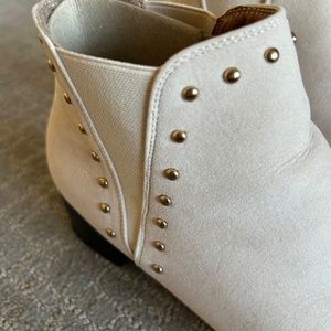 New with tags. Introducing a brand new pair of Seven7 style name Pixie women's boots in ivory cream faux suede material. These boots feature a western style chelsea boot with brass studded accents that add a unique touch to the design. Chelsea slip in elastic side for comfort. This model is perfect for any outfit, and these boots come in a US shoe size 9. Heel height approx 1.5”.