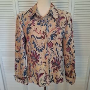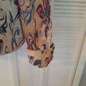 gorgeous vintage tapestry blazer from Oscar De La Renta. fully lined with 4 button closure. looks great with a solid color dress or jeans. size is 14. armpit to Armpit is 21", shoulder to hem is 24". very minimal signs of wear.