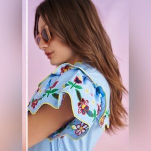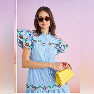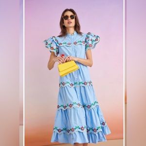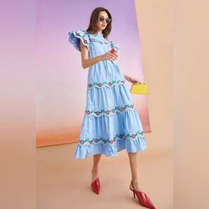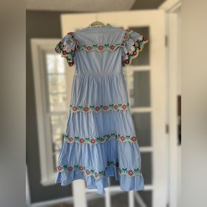 Long, below the knee blue short sleeved dress. With red and green accents in the form of flowers to add a pop of color. Adjustable waist. The ruffled sleeves and the 100% cotton.