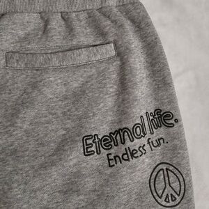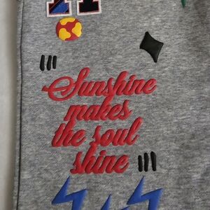 First Row Flying Heart All Over Graphic Streetwear Joggers. Featuring- a slim & tapered silhouette, super soft cotton blend & cozy fleece feel inside, adjustable drawcord waist, matching ribbed waist & ankles, dual functional side pockets, rear pocket, and colorful all over embroidered patches that make them pop. Please refer to pics for approximate measurements and fabric content. High quality, style, and exceptional like new condition.