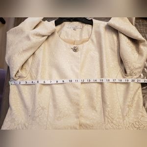 Beautiful 3/4 cuff sleeve jacket with one top button and hidden snap closures down the front. Pencil skirt with back slit. Customized alterations. Originally Size 18 and 20. See pics for PTP and waist measurements.