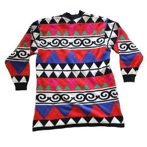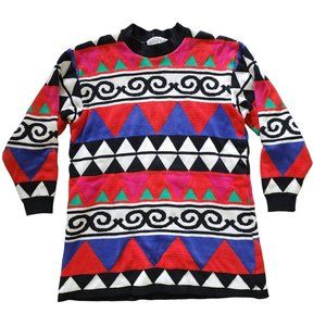 - crew neck - large geometric print - black and white, with pink, red and green triangles - tunic length, covers the bum. could be worn as a sweater dress if you are petite (model is 5'5) Size: Marked medium. Measurements in photos. Condition: very good. No stains or holes.