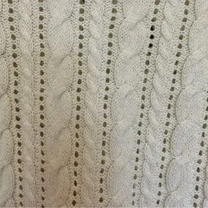 Features a cream ivory wool cotton blend knit fabric, alternating cable knit and crochet vertical pattern and 3/4 length sleeves.