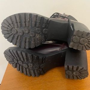 * Women’s size 7.5 Steve Madden Noodles Combat Bootie with laces and zipper closure, 3 inch heel, maroon patent color with black soles