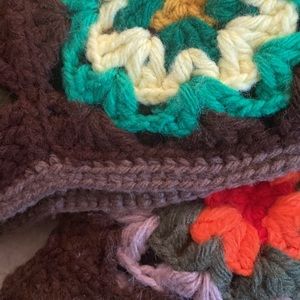 Vintage. Granny square homemade Afghan/blanket. Color is brown, green red orange, and the hem is scalloped in a lighter brown shade. Measurements are 80 inches in length and 50 inches in width beautiful retro look.