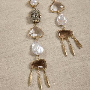 Cascading enchantress, this bewitching earring uses clear and smoky quartz, natural pyrite clusters, and creamy white pearl accented with sparkling golden metals.