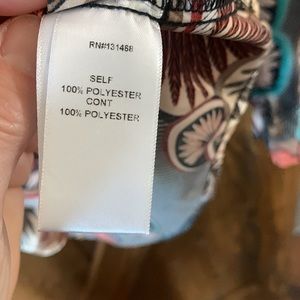 Blouse is made of flowy soft fabric with beautiful colors of cream, teal, black, cinnamon, burgundy, & beige. Elastic at cuff with 3 fabric covered buttons at neck in back.