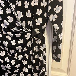 Size medium Anne Klein blouse. Black with floral design. Cinched waist; very flattering. 3/4 sleeves; polyester blend. Worn twice