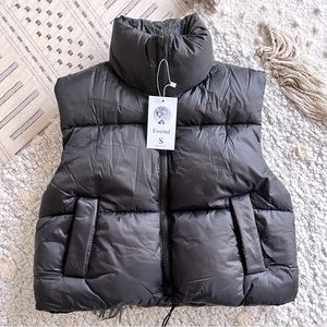 This chic and shiny black puffer vest features a cropped look and cinched waist loop. Zippered closure. Perfect for fall or transitional weather! ๐ค