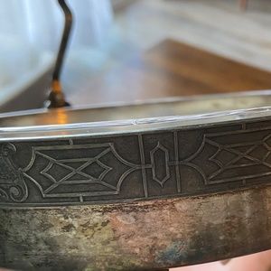 Divided glass dish set into a footed electroplated nickel silver open bottom tray with handle from Benedict Mfg Co.  The glass dish is able to be removed for easy cleaning.  I haven't been able to confirm the manufacturing dates for the Chinese Chippendale pattern, but Benedict Mfg was established in 1894 and closed in 1953.  There is a very small chip in the outside rim of the glass dish.  The silver plate shows tarnishing.