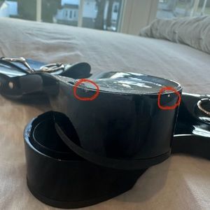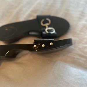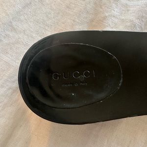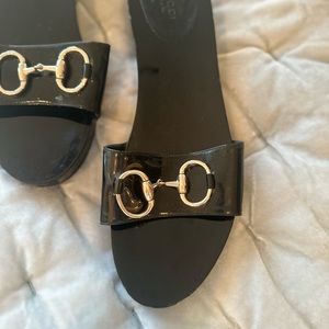 The vintage Gucci Horsebit slide on black and gold sandals are a women’s size 8 and were loved and worn. Although they do have some scuffs (pictured and circled), they are still in good condition! They would go great with many outfits and have gold detailing on the sides in addition to the “horsebit” detailing on the top.