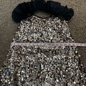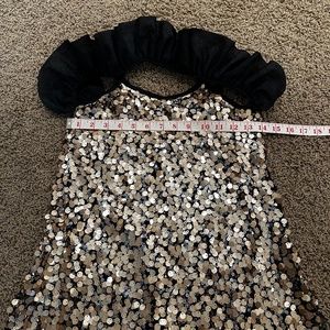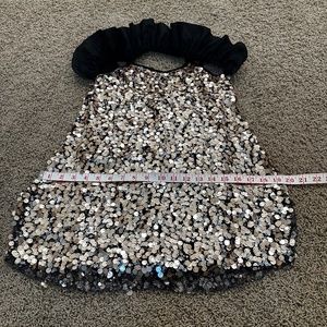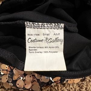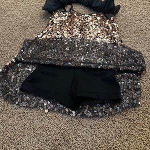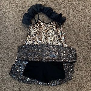 Size small adult gold sequin dress with built in biketard. Ruffle halter. Adjustable black straps. Was used for skating but could be used for dance or just for fun- dress-up, halloween, ect.