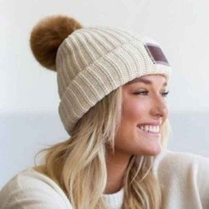 In excellent condition White knit Cuffed style hat with detachable tan faux fur pompom