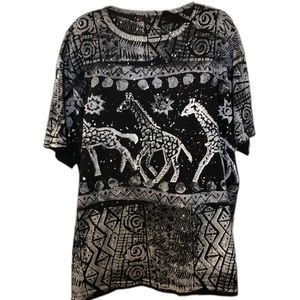Vintage 1990s EZL Women's Black Painted Mayan Aztec Style Top and Pants Set. Pant and shirt set is vintage 1990s pre-owned. Was not worn much if at all - was my MIL's. The top is one size and is roomy so could fit most sizes (refer to measurements). The pants are a size medium knit with elastic waist (refer to measurements). If someone doesn't think the pants would fit, the shirt could which I priced more for the shirt an am just including the pants - the shirt is the star of this listing - the pants are just normal knit pants (no brand listed not sure it considered EZL like top). The shirt is very chic looking - it has what appears to be painted areas with designs of abstract Mayan or Aztec - giraffes, too. She used to buy things from boutiques when traveling a lot and then they would hang in the closet. RN 72519. Sort of round scoop type neckline short sleeve very room top. 100% cotton. Made in USA. Approximate measurements: Shirt 26 inches long x 24 inches pit to pit and pants waist 26.5 inches x 36 inches long top to bottom and 26 inch inseam with rise of 14 inches - my MIL is on the petite size so these may be more of a Capri style on some considering the length.