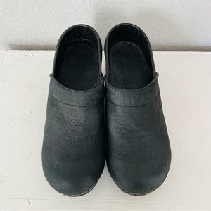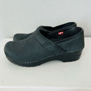 Sanita tooled / embossed black sueded leather clogs. Rose / floral design. In great pre-loved condition - trim is intact, minimal wear to soles.