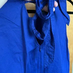 Features scoop neckline with tie across V-shaped back, darted bust and hidden back zipper, adorable ruffle at hem, and gorgeous royal blue color that compliments many complexions!