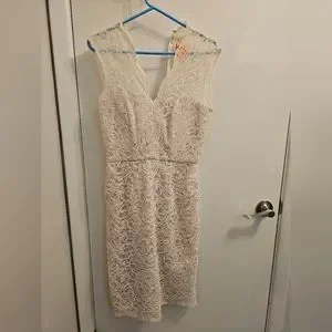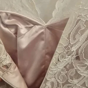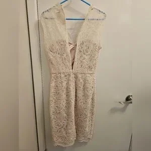 White lace dress with pink underlayment
