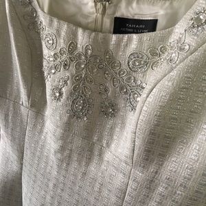 Immaculate condition, like new, no issues! 68/16/16% poly/cotton/metallic. Fully lined. Dress is Approximately 16 inches across armpits, 38 inches long, 14 inches across the waist and 18 inches across hips. Thanks! 🐾
