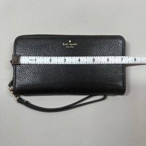 Discover the epitome of style meets convenience with this Kate Spade Black Leather Wristlet Wallet. The rich pebbled leather and gold-tone accents speak volumes of its understated elegance. Not just a wallet, it's a statement with its wristlet strap adding both flair and practicality. Inside, find ample storage with card slots, a clear ID window, and a secure zip pocket, all designed to keep your life organized in its chic embrace.