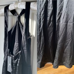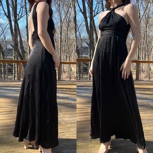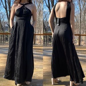 NWT’s 100% silk material, Banana Republic brand, halter style maxi formal dress. Absolutely beautiful black silk dress with pockets ! Square style open back, zip up closure in the back, thick straps, criss cross style with slit opening between chest area to knot like feature to make a gorgeous halter. Such nice quality & lightweight, would be perfect for prom, date night, dance, black tie, wedding, or other formal event ! Orig price $300, size 2.